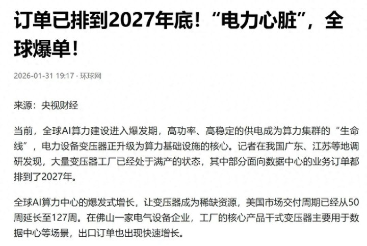 为啥突然爆单?直接原因是全球AI算力中心爆发。GPU集群耗电量惊人,稳定、高功率的供电是“生命线”,变压器直接从“配套设备”升级为“核心基础设施”。