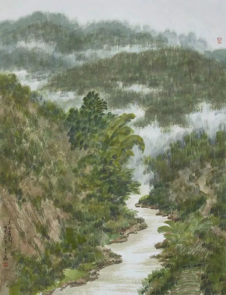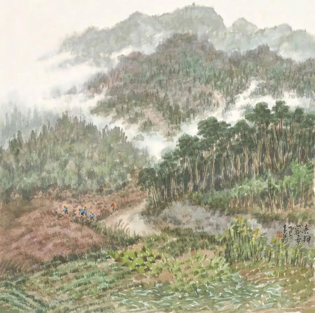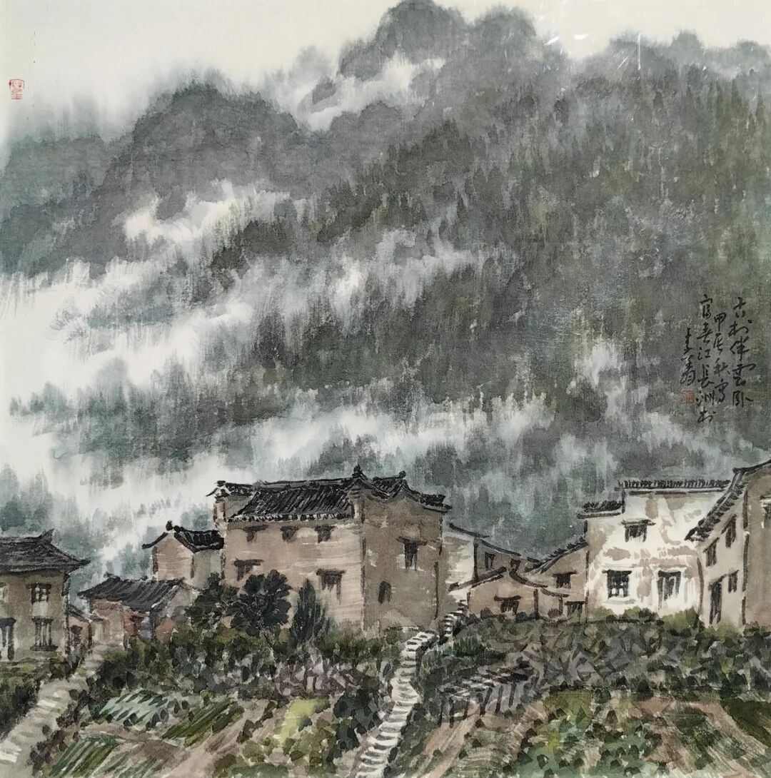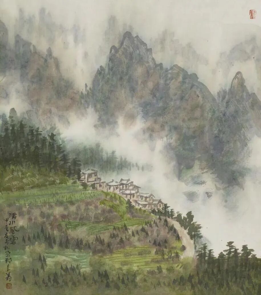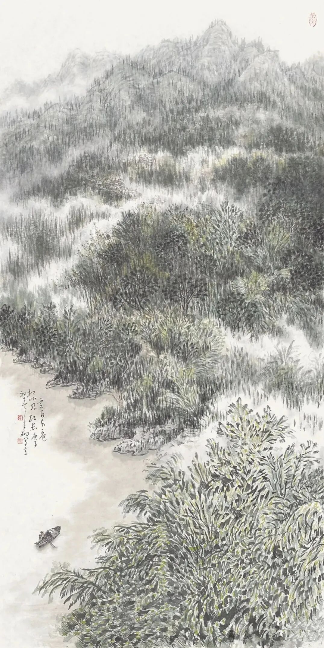 这位曾执掌解放军艺术学院的教授、如今身居中国美术家协会副主席的艺术家,笔下从无剑拔弩张的激烈,反倒常以“水、云、山、田”为骨,将人间烟火悄然藏进墨色深处。他画南方山水,不刻意摹写奇峰险壑,偏爱捕捉寻常景致里的诗意:或许是春雨后斜倚田埂的竹,或许是暮色中飘着炊烟的木舍,又或许是云雾里若隐若现的黛瓦,恰似陶渊明“采菊东篱下”的闲逸,于朴素处见真味。