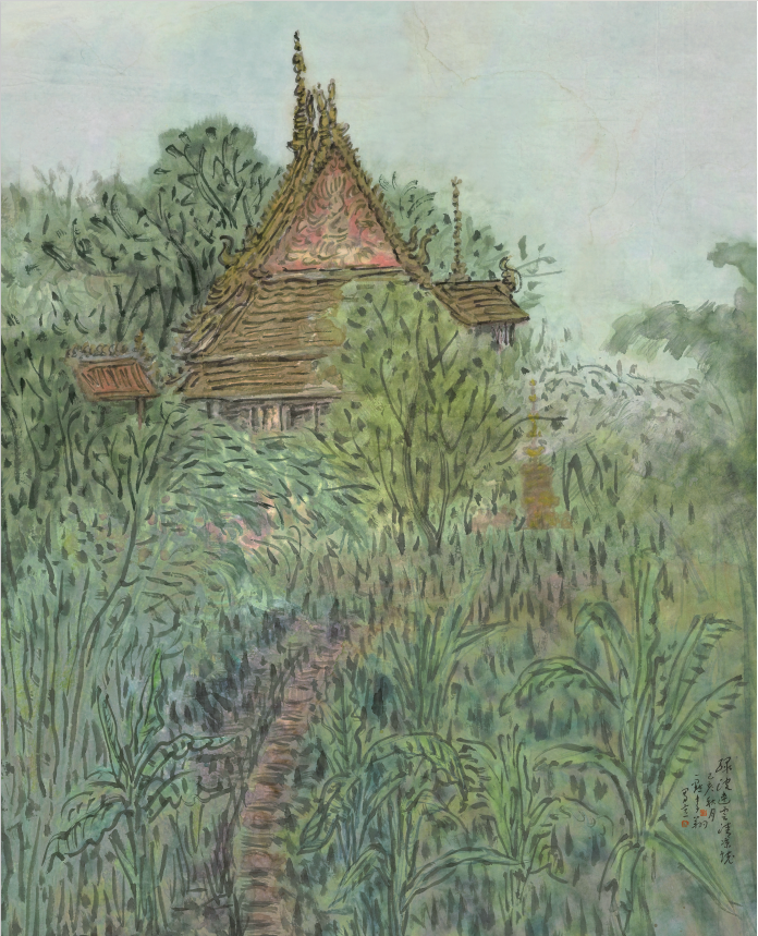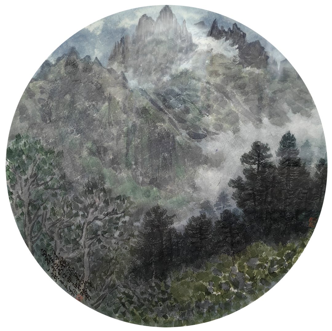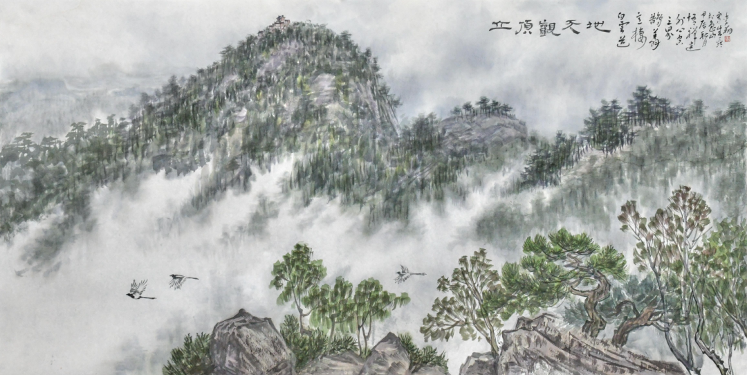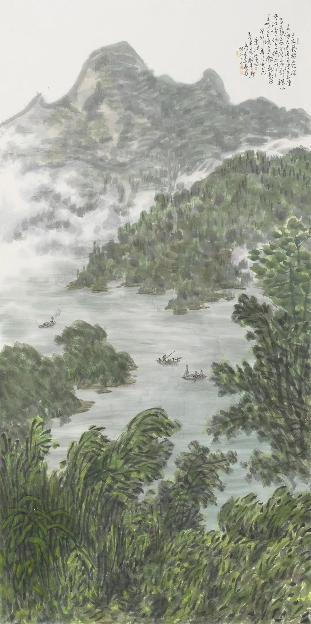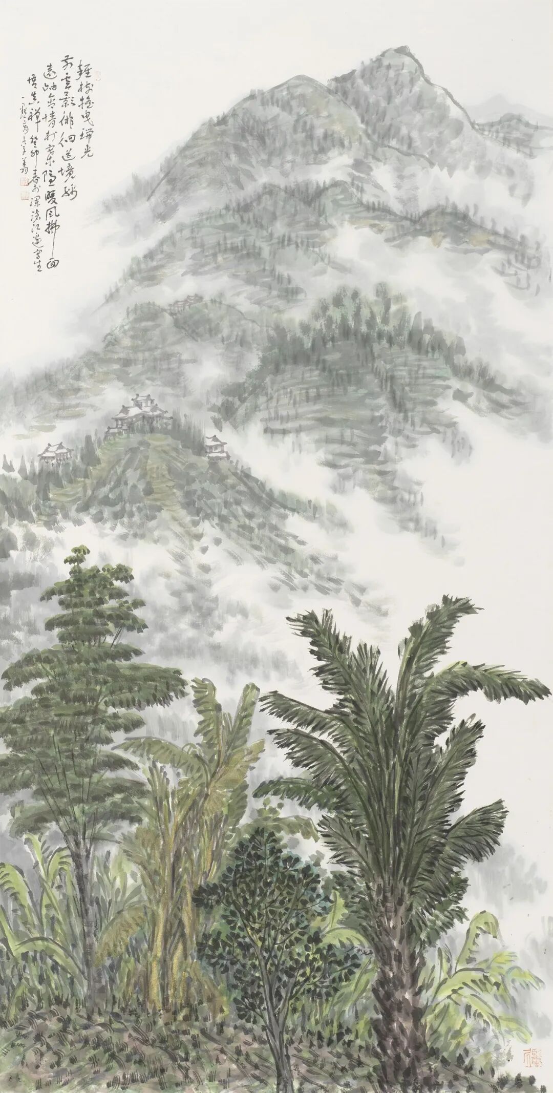 这位曾执掌解放军艺术学院的教授、如今身居中国美术家协会副主席的艺术家,笔下从无剑拔弩张的激烈,反倒常以“水、云、山、田”为骨,将人间烟火悄然藏进墨色深处。他画南方山水,不刻意摹写奇峰险壑,偏爱捕捉寻常景致里的诗意:或许是春雨后斜倚田埂的竹,或许是暮色中飘着炊烟的木舍,又或许是云雾里若隐若现的黛瓦,恰似陶渊明“采菊东篱下”的闲逸,于朴素处见真味。