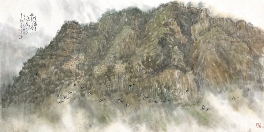 有人说,李翔的画里有“诗词的魂”。诚然,他的画不是简单的“再现山水”,而是“以画为诗”——画里有王维的“空”,有陶渊明的“淡”,有孟浩然的“真”。他不刻意堆砌典故,却让每一笔墨都沾着文气:画里的草舍,是“故人具鸡黍,邀我至田家”的亲切;画里的远山,是“青山横北郭,白水绕东城”的开阔;画里的云雾,是“行到水穷处,坐看云起时”的从容。这份“文心”,不是掉书袋的雅致,而是骨子里的修养——他曾说“画要接地气,要懂人心”,所以他的画里没有居高临下的疏离,只有“把百姓的日子画进笔墨里”的真诚。